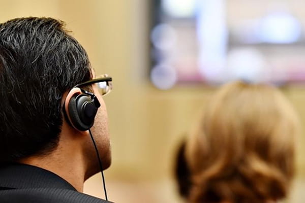 Устный синхронный перевод услуги осуществляется переводчиком параллельно докладу, без наличия пауз в речи докладчиков, в специальных кабинках. Участники мероприятия пользуются микрофонами, наушниками, чтобы слышать выступления на их языке.